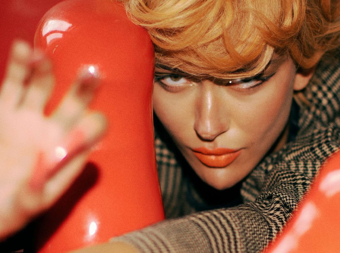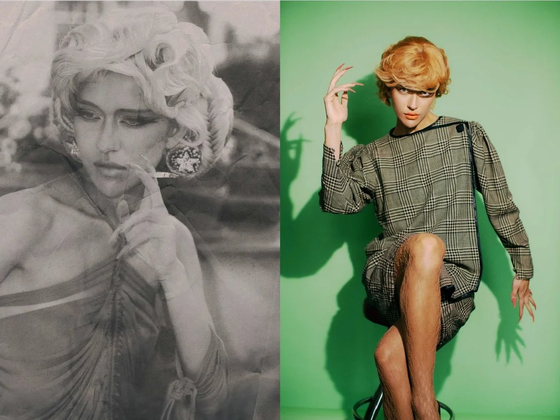 Left: Sequin& lace underwear set Bottega Veneta @nightboutique SunglassesBottega Veneta @nightboutique /Salmon Color Wig/ Wig creationand hairstyling Sabin Bolognini @sabomakeup @creammakeupacademy Right: Red fringe off shoulderdress: Bottega Veneta @nightboutique