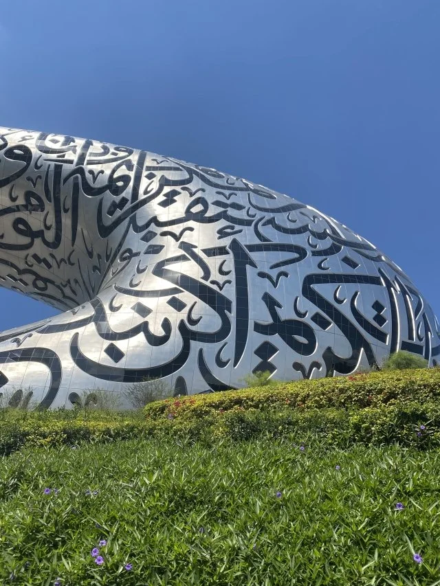 ARABISCHE KALLIGRAFIE In de roestvrij stalen wanden van het surrealistische bouwwerk zitten grillig gevormde ramen, elk in de vorm van drie citaten, geschreven in Arabische kalligrafie. De zinnen zijn citaten van de Sjeik, eentje hiervan luidt: ‘We leven misschien niet honderden jaren, maar de producten van onze creativiteit kunnen een erfenis achterlaten lang nadat we er niet meer zijn.’